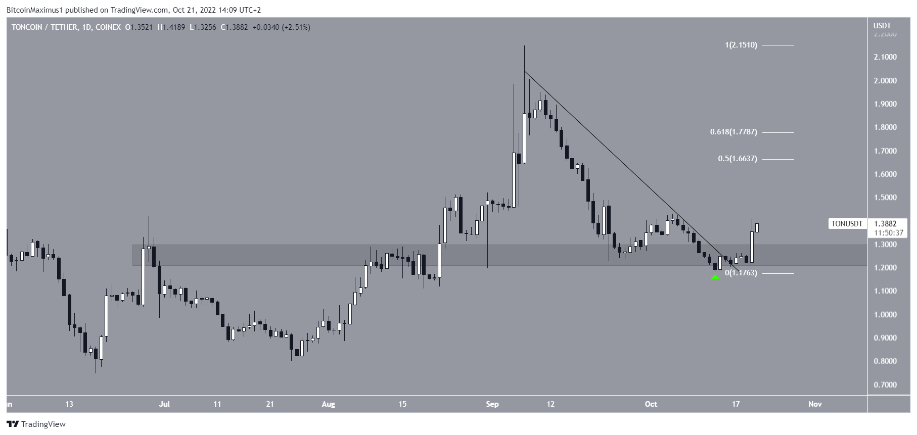 A TON está subindo desde que saltou na área de suporte horizontal de US$ 1,25 em 13 de outubro (ícone verde). Pouco depois, o preço do Toncoin saiu de uma linha de resistência descendente.