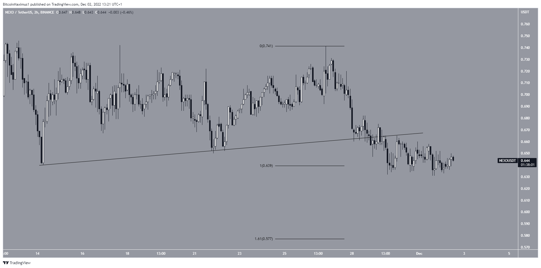 O preço da NEXO está em queda desde que atingiu um topo em US$ 0,74 no dia 26 de novembro. A queda causou um rompimento abaixo de uma linha de tendência de alta três dias depois.