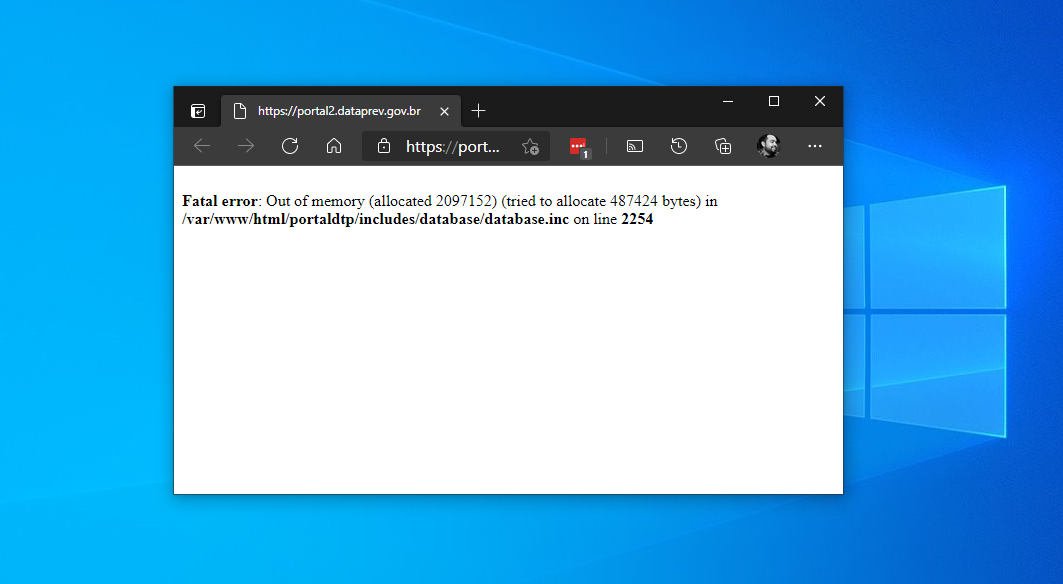 Em testes realizados pelo BeInCrypto, diversas páginas do DataPrev aparecem fora do ar, acusando falha de carregamento. Um dos erros acusa falta de memória disponível, falha que costuma indicar sobrecarga no servidor que hospeda o site.