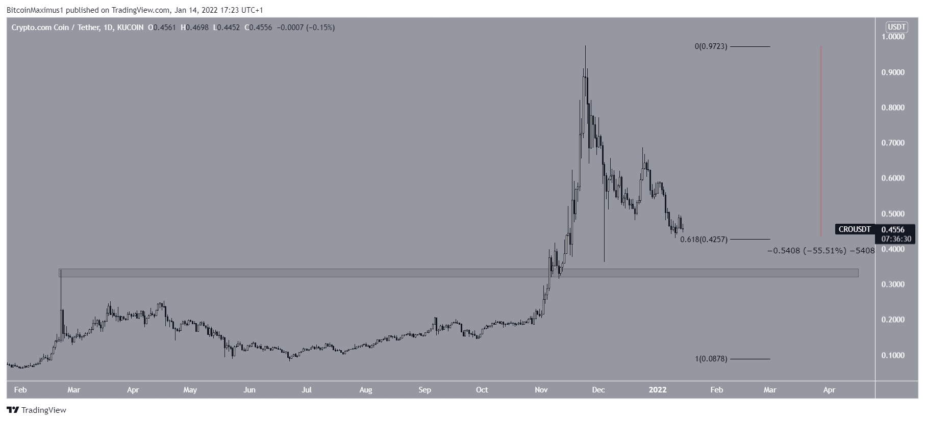 No entanto, a CRO está logo acima da área de suporte de US$ 0,42, que é o nível de retração de 0,618 de Fibonacci. Há também suporte horizontal em US$ 0,32.