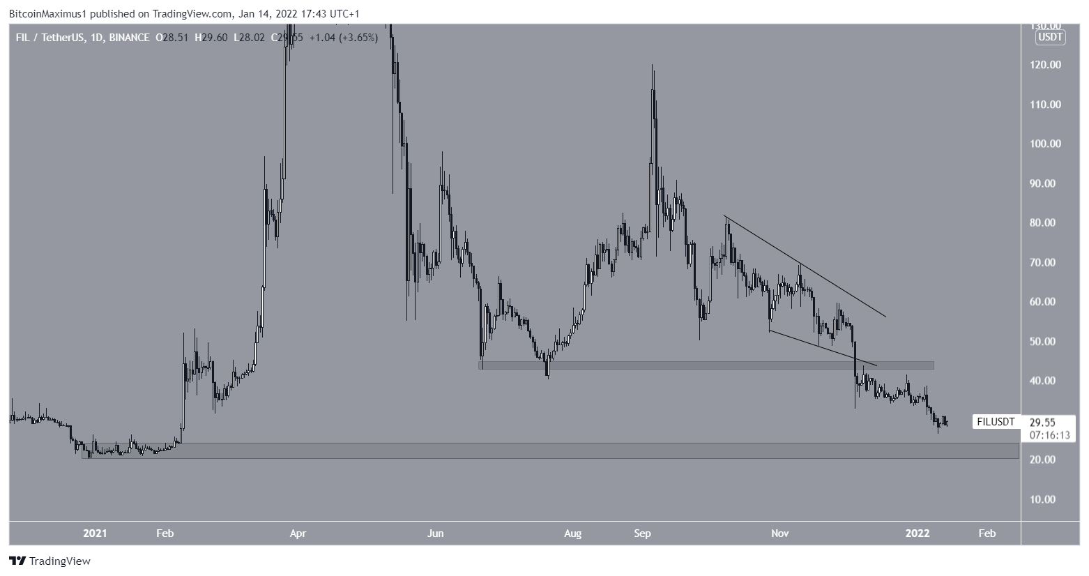 A FIL está em tendência de baixa desde 5 de setembro. No dia 4 de dezembro, ela rompeu abaixo de uma cunha de baixa e a área horizontal de US$ 44, acelerando ainda mais seu movimento de queda.