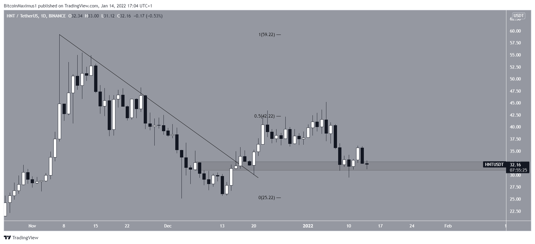 No dia 17 de dezembro, o HNT rompeu acima de sua linha de tendência de baixa. O token voltou para validá-la como suporte três dias depois (ícone verde) e retomou seu movimento de alta em seguida.