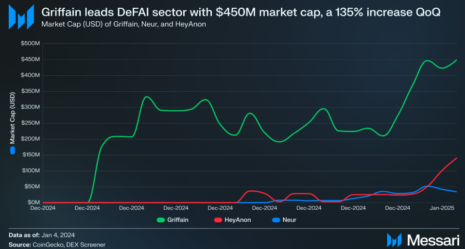 Embora o DeFAI, ainda esteja em sua fase inicial, ele possui uma capitalização de mercado próximo a US$ 1 bilhão. Segundo a Messari, a Griffain lidera o setor com uma avaliação de US$ 450 milhões — um aumento impressionante de 135% trimestre a trimestre.