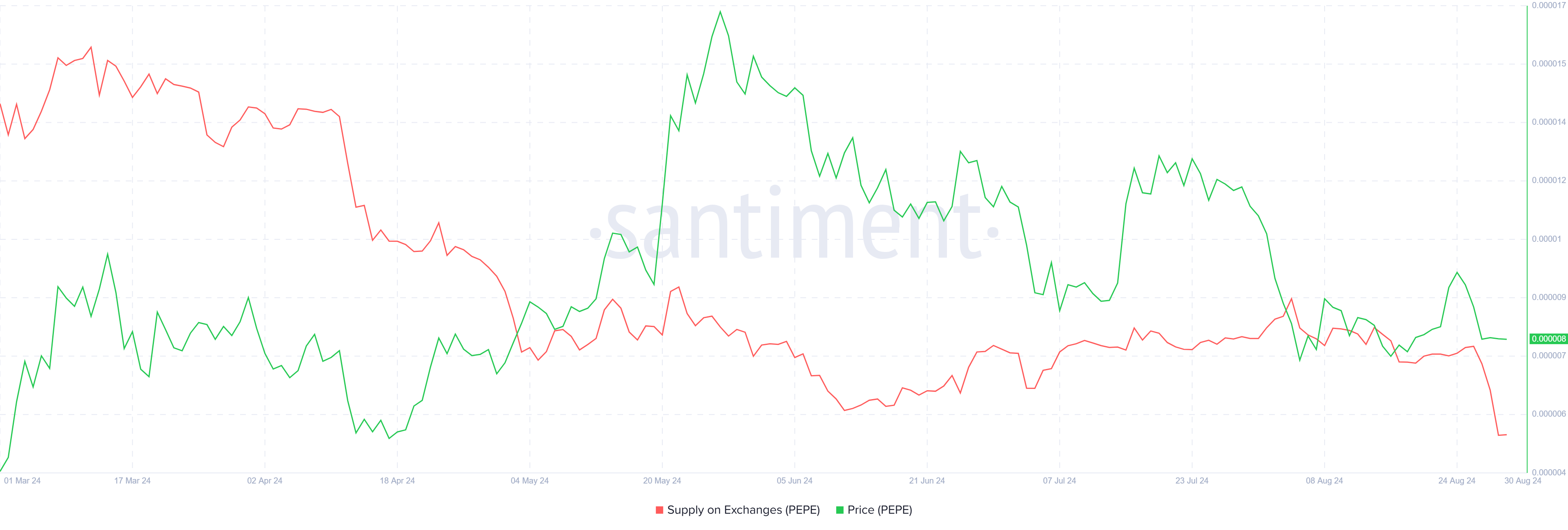 A recuperação do preço do PEPE pode ser impulsionada por seus investidores, caso não seja pelo mercado mais amplo. Os detentores existentes estão ativamente buscando uma recuperação no preço, comprando mais de 4 trilhões de tokens (aproximadamente US$ 30,8 milhões) das exchanges em apenas três dias.