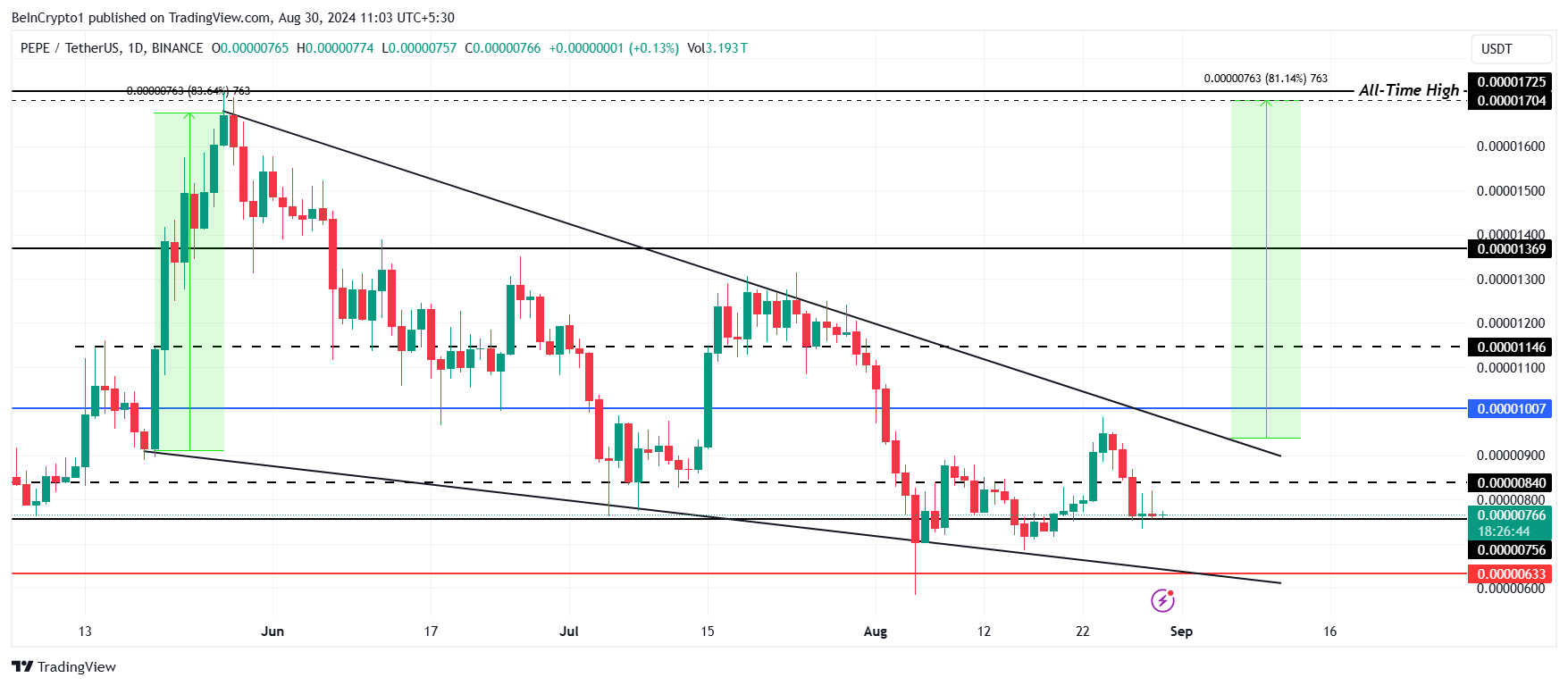 O preço atual do PEPE está focado apenas em se recuperar do suporte em US$ 0,00000756. Negociando a US$ 0,00000766 no momento da redação, a moeda meme tem se mantido acima deste nível de suporte nas últimas 72 horas.