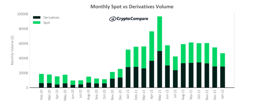 Em janeiro, o volume do mercado de derivativos atingiu quase US$ 3 trilhões. Isso representou quase 60% do volume total de criptomoedas, superando todas as outras negociações pela primeira vez.