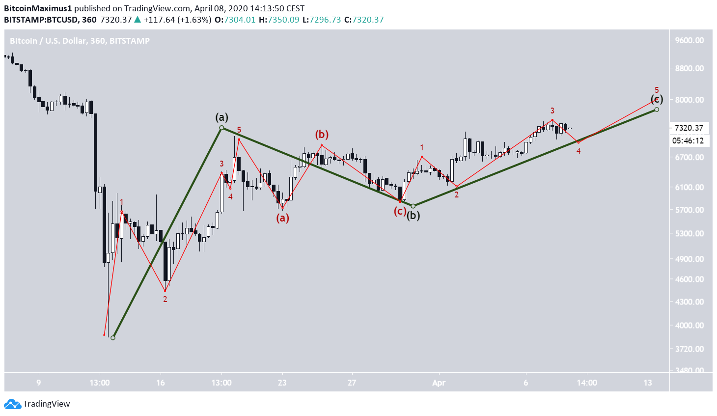 A contagem de ondas corretivas A-B-C começa com a baixa de 13 de março de US $ 3.850. Se a contagem estiver correta, o preço do Bitcoin está atualmente no processo de conclusão da onda C, que é a onda final que completa a formação.
