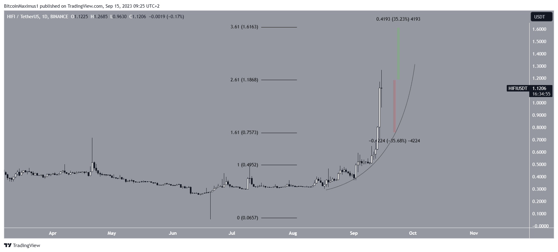 A HIFI pode cair para a área de suporte de US$ 0,75 se ocorrer uma rejeição. Isto coincide com a linha de suporte ascendente parabólica e é a extensão 1,61 desse aumento original.