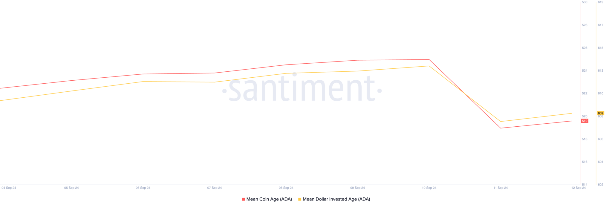 De acordo com a Santiment, essas métricas que rastreiam o comportamento dos detentores de longo prazo apresentaram uma queda em 11 de setembro. Essa queda sugere que detentores de longo prazo, que geralmente compram a preços mais baixos, estão vendendo para realizar lucros. Essa venda reduz a idade média das moedas em sua posse.