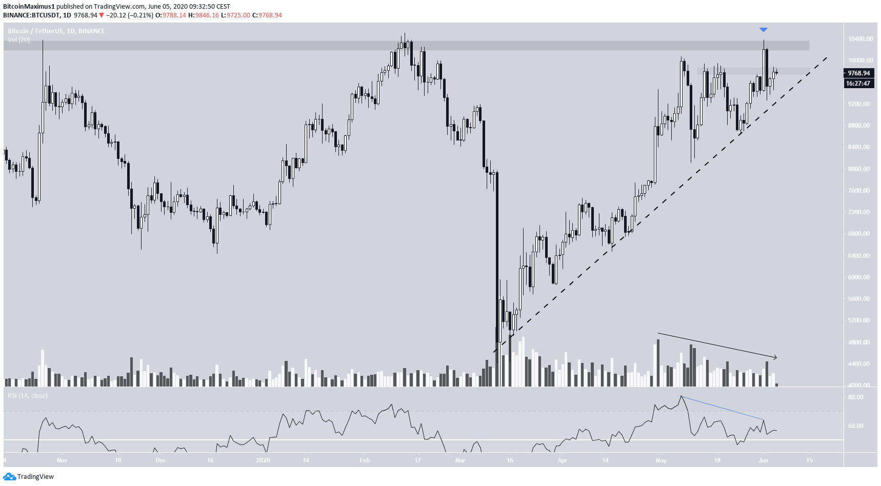 No entanto, no curto prazo, o BTC acabou de criar um candle de alta com volume muito alto e está novamente diretamente abaixo da linha de resistência descendente que tenta romper. Isso poderia causar outra tentativa de ultrapassar os US $ 9.840, mas, devido à divergência de baixa e resistência acima mencionadas, espera-se que fracasse.
