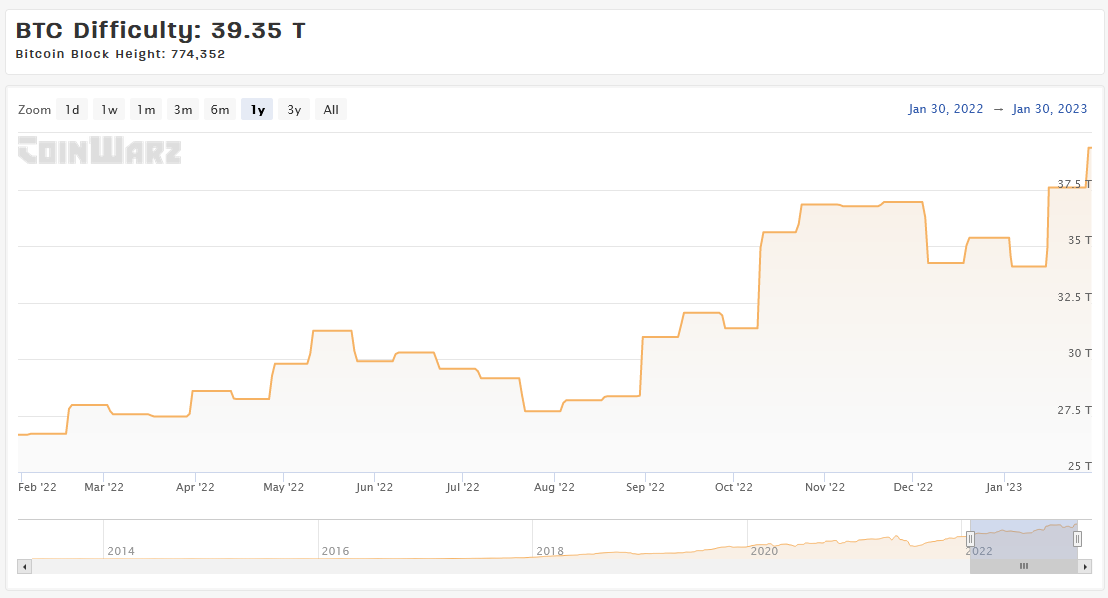 A dificuldade de mineração do Bitcoin tem aumentando desde o início de 2022, quando o inverno cripto entrou em cena. Em janeiro do ano passado, ela estava em 26,24 EH/s, sofrendo um aumento de quase 50% ano a ano.