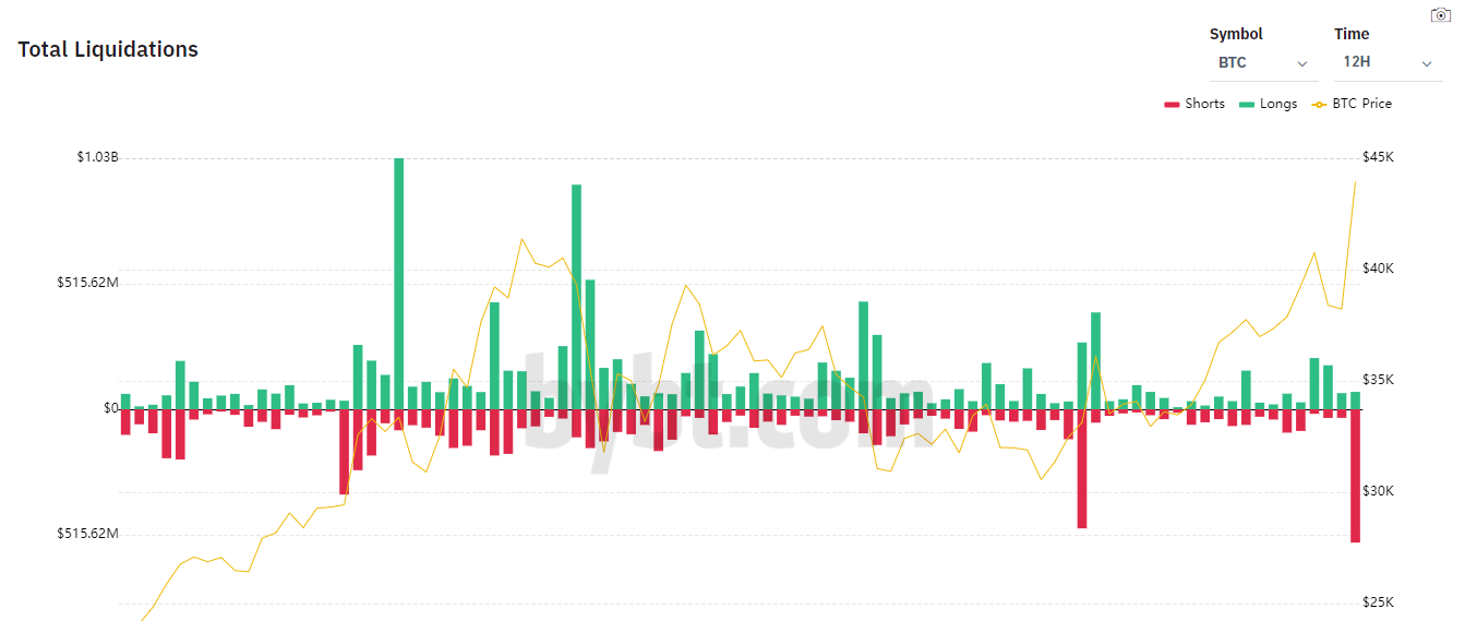 Liquidação bilionária de shorts ocorre após o Bitcoin passar de US$ 44.000 com a notícia de que a Tesla comprou US$ 1,5 bilhão em BTC.