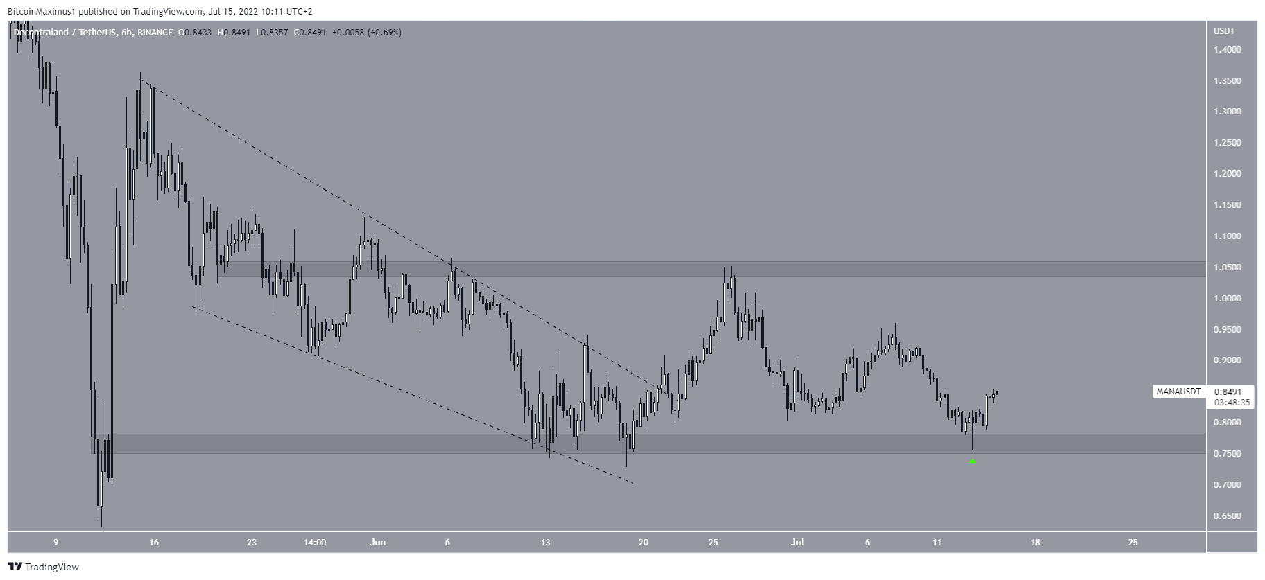 Em 22 de junho, a MANA rompeu sua linha de tendência de baixa. No entanto, seu preço não conseguiu sustentar esse movimento de alta e voltou para a área de suporte horizontal de US$ 0,765.