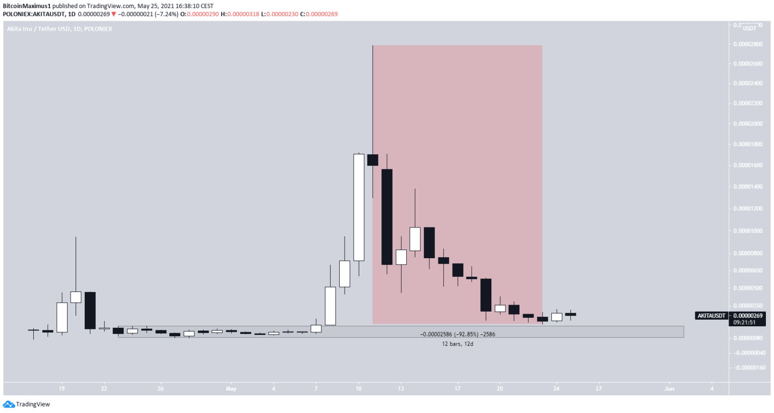 A AKITA vem caindo desde 11 de maio, quando atingiu a máxima de US$ 0,00002875. O movimento culminou com uma queda até os US$ 0,00000199, atingida em 12 de maio. Isso representou uma desvalorização de 92,85%, caindo abaixo de todos os níveis de retração de Fibonacci.
