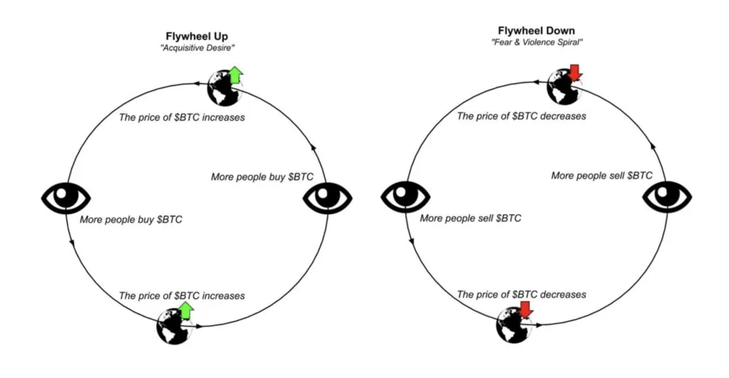 A influência é contínua e circular; isso é o que o torna em um loop de feedback. Daí a famosa analogia da roda. Os preços impulsionam o desejo, o desejo impulsiona os preços.