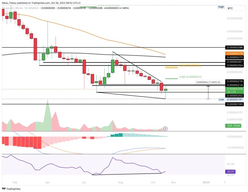 No contexto do desempenho em relação ao Bitcoin (BTC), a Dogecoin subiu mais de 11,5% durante a semana. Neste tempo gráfico, houve anteriormente uma divergência de alta observada no RSI.