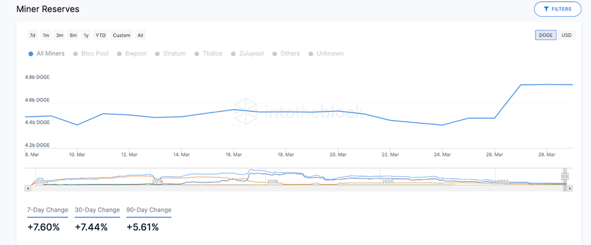 De acordo com a plataforma forense blockchain IntoTheBlock, os mineradores Dogecoin aumentaram suas reservas em quase 360 milhões de moedas em março de 2023.