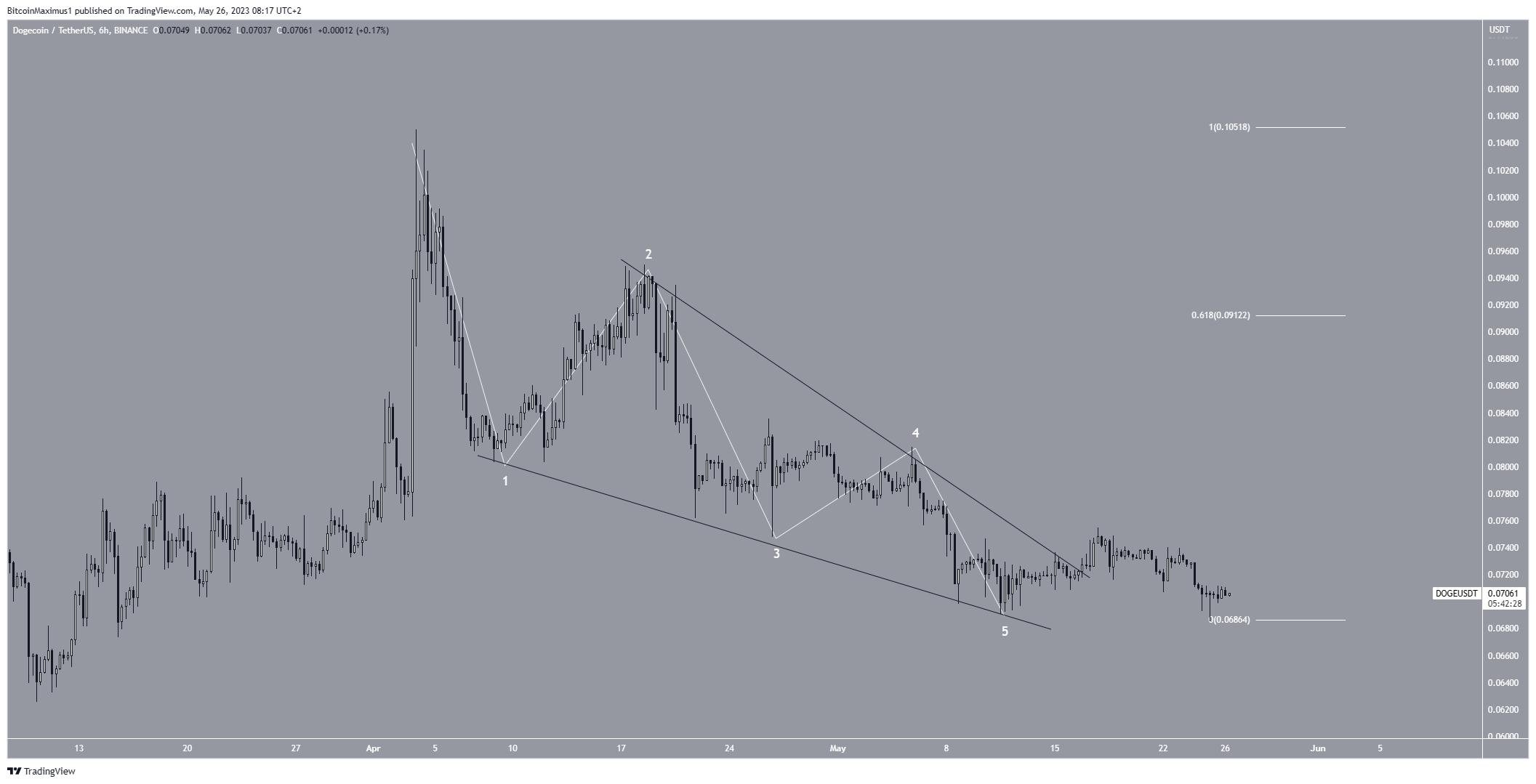 As leituras do gráfico de seis horas fornecem uma previsão de alta para a DOGE, pelo menos no curto prazo. A principal razão para isso é a contagem de ondas.