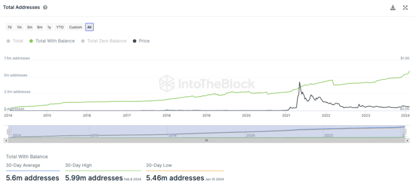 Entrando no novo ano, a rede Dogecoin apresenta uma trajetória positiva, com o número de endereços detentores de DOGE atingindo aproximadamente 5,6 milhões.