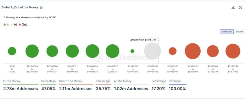 Atualmente, 47% dos endereços DOGE estão no lucro. Em contrapartida, quase 36% dos endereços estão sofrendo perdas. Além disso, aproximadamente 17,2% dos detentores de DOGE estão em um ponto de equilíbrio, onde a venda de seus tokens DOGE ao preço de mercado atual não resultaria nem em lucro nem em perda.
