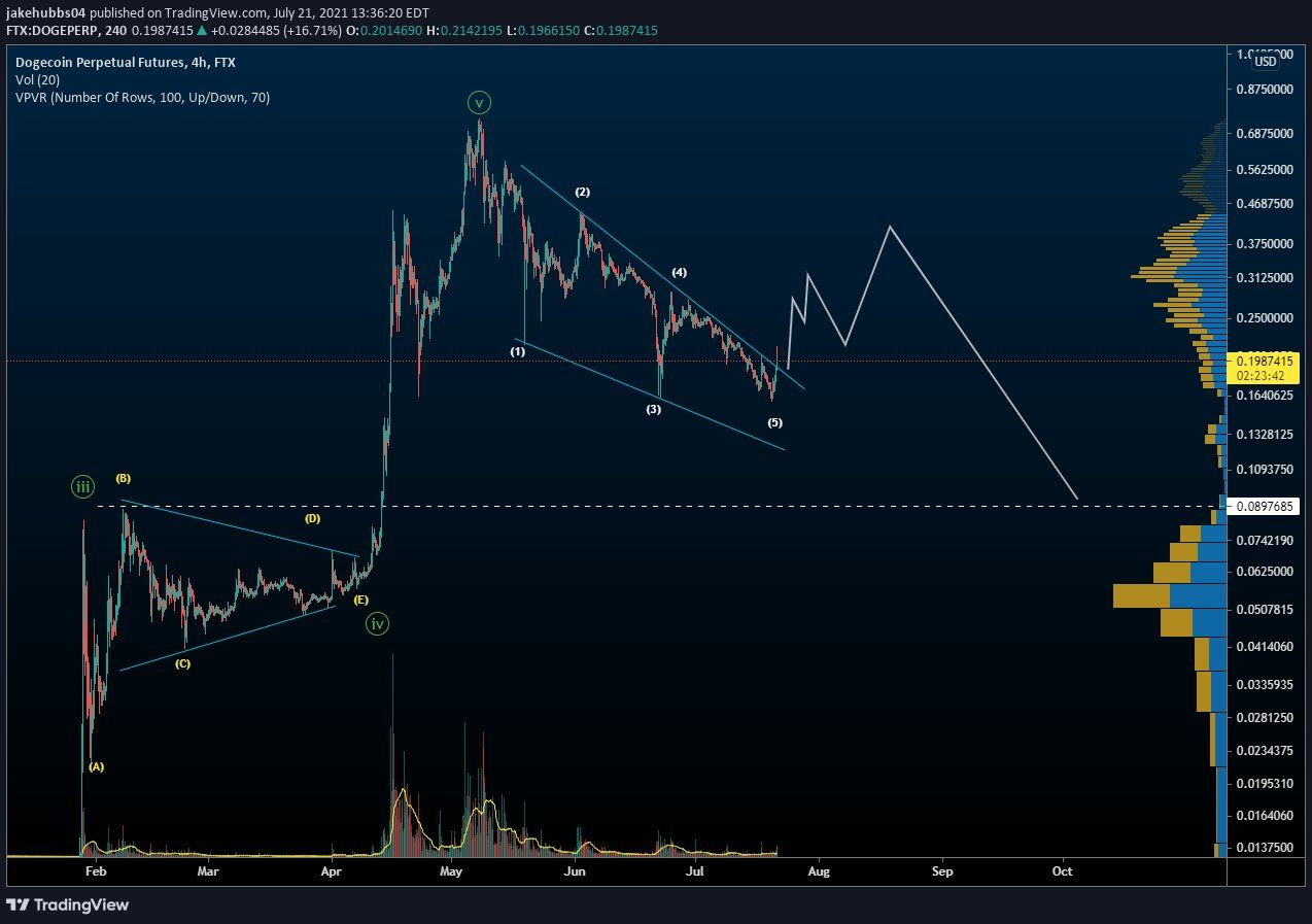 A DOGE entrou em uma grande tendência de alta desde março de 2020, que culminou na sua máxima histórica de US$ 0,74 no dia 8 de maio deste ano.