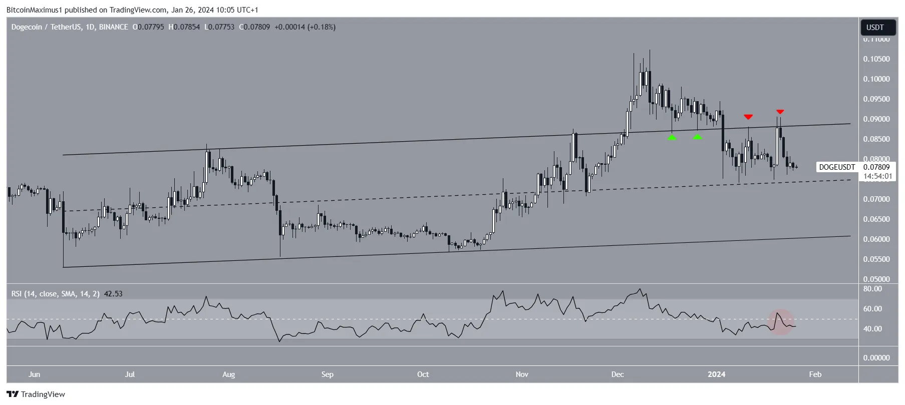 A análise técnica do gráfico diário mostra que a DOGE foi negociada dentro de um canal paralelo de alta desde junho de 2023.