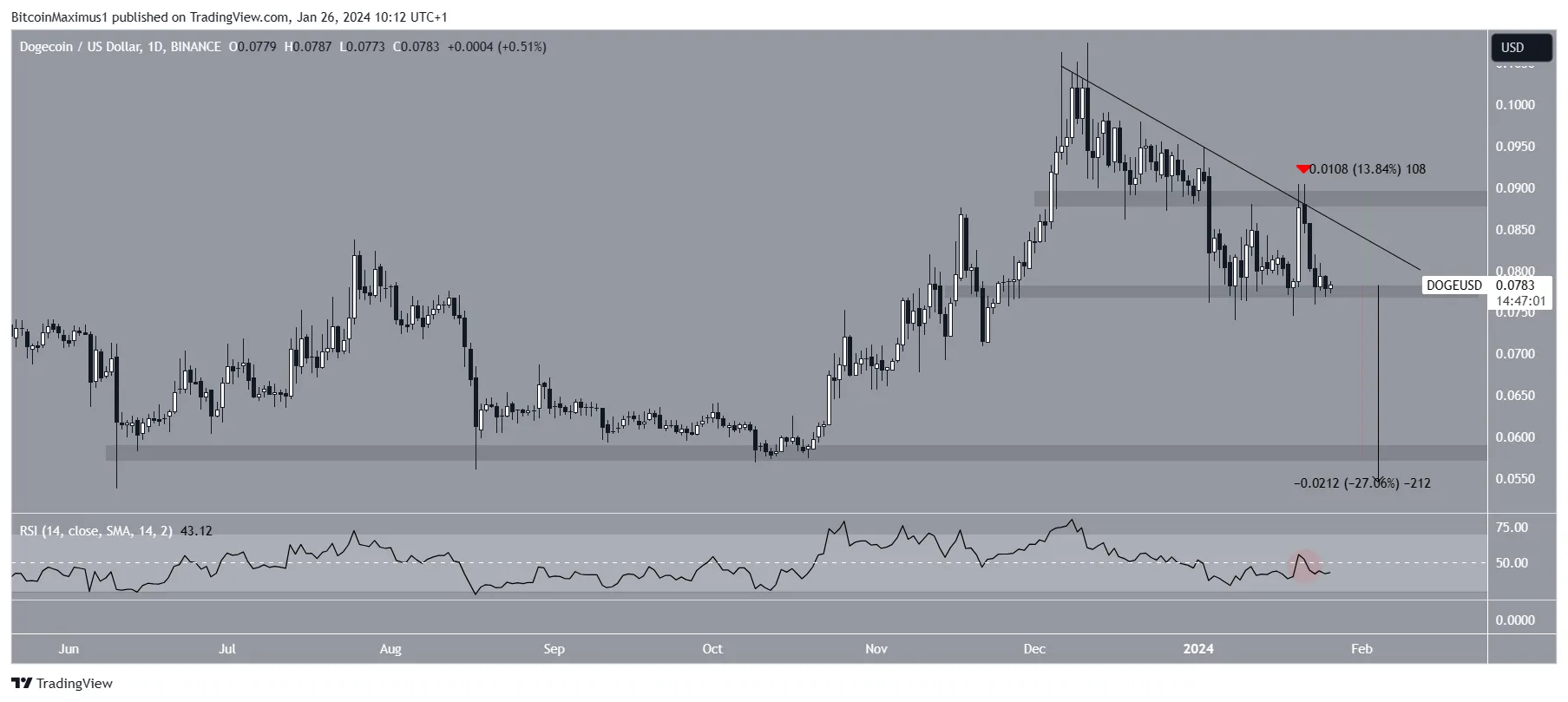 A ação do preço mostra que a Dogecoin caiu abaixo de uma linha de tendência de baixa desde a alta de dezembro mencionada acima. Mais recentemente, a linha causou uma rejeição (ícone vermelho) em 21 de janeiro de 2024.