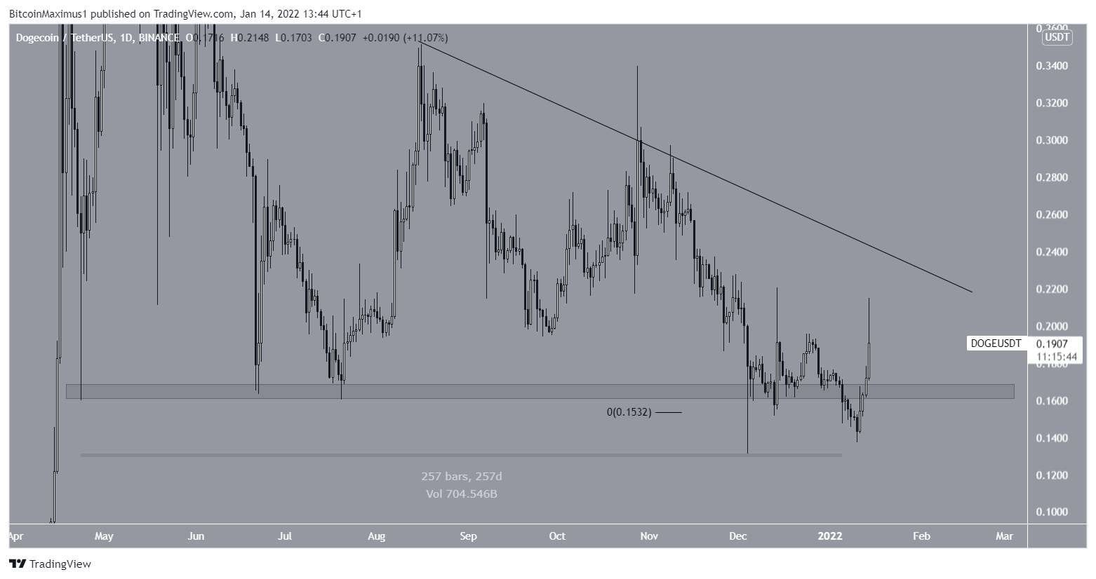 Na última segunda-feira (10), a DOGE caiu para US$ 0,136. Este foi um movimento muito pessimista, pois indicou que o token havia rompido abaixo da área de suporte de US$ 0,165, que estava em vigor há 257 dias.