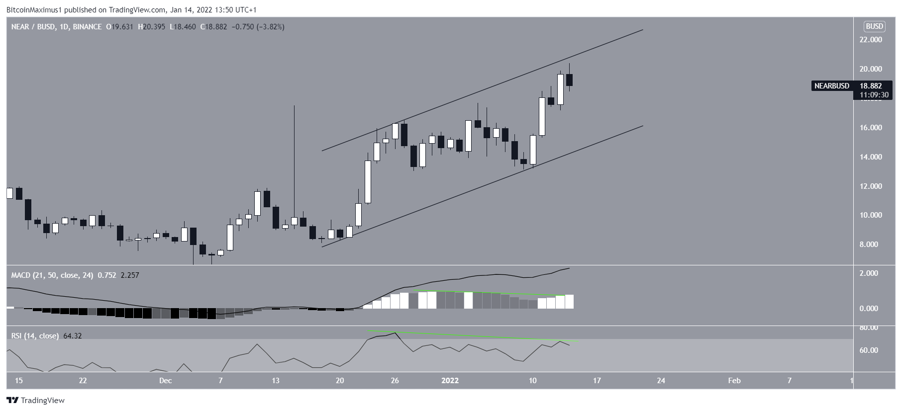 NEAR está dentro de um canal de alta desde 18 de dezembro. Isso a levou a atingir uma nova máxima histórica de US$ 20,4 na sexta-feira. A alta foi feita muito perto da linha de resistência do canal.