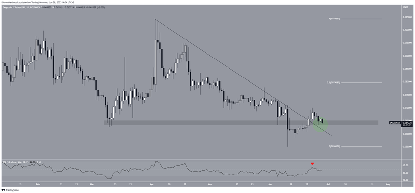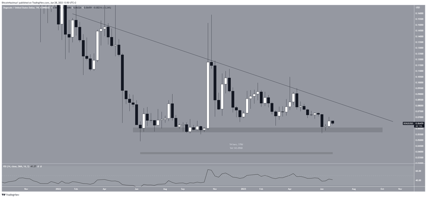 A análise técnica do período semanal mostra que o preço da DOGE caiu significativamente no início de junho, atingindo a área de suporte horizontal de US$ 0,06.
