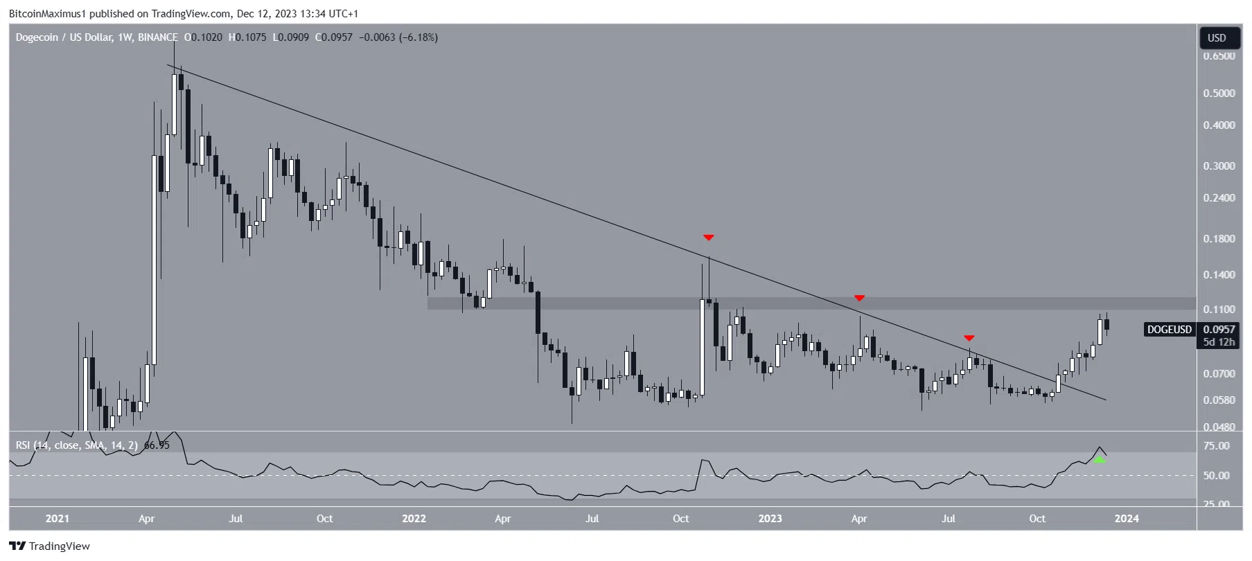 A análise técnica do gráfico semanal mostra que a DOGE seguiu uma linha de tendência de baixa desde que atingiu seu preço recorde em maio de 2021.
