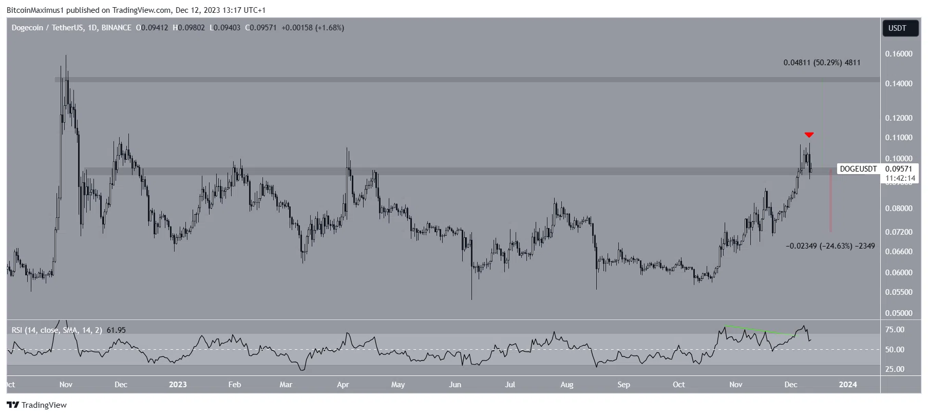 Apesar da alta anual, o ativou criou um candle de baixa (ícone vermelho) e caiu significativamente. No entanto, a DOGE ainda é negociada dentro da área de suporte de US$ 0,095.
