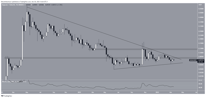 O preço do Dogecoin caiu sob uma linha de resistência descendente de longo prazo desde que atingiu sua máxima histórica de US$ 0,739. A queda levou a uma baixa de US$ 0,049 em junho de 2022.