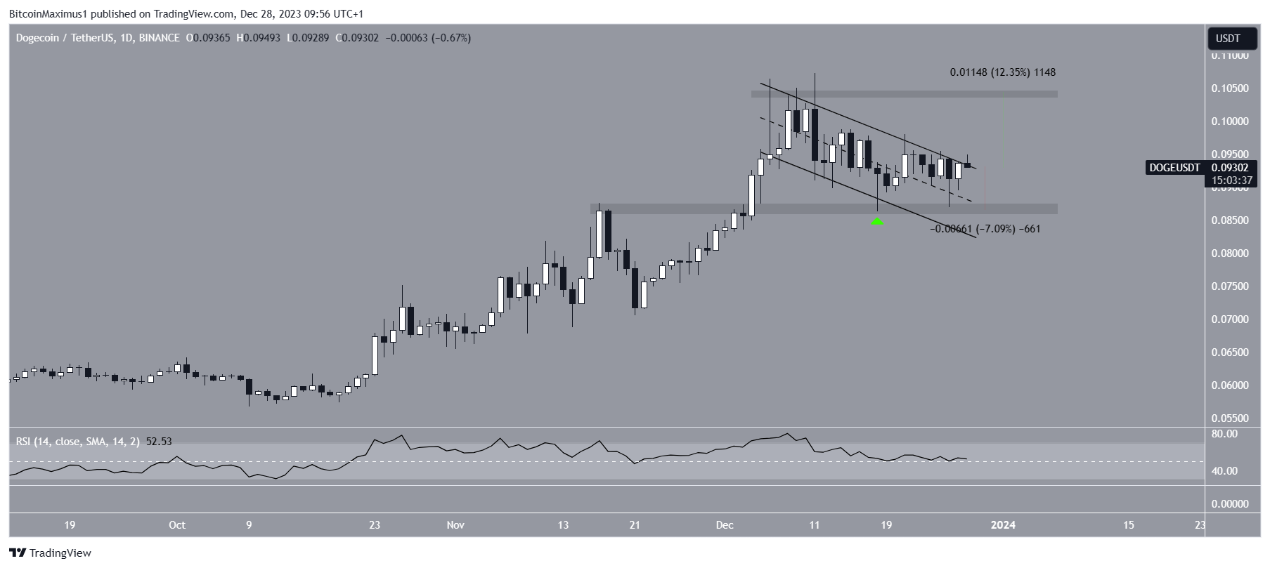 O preço saltou na linha de suporte do canal e na área de suporte horizontal de US$ 0,087 em 18 de dezembro, criando um longo pavio inferior (ícone verde). Atualmente, a memecoin está tentando sair do canal.