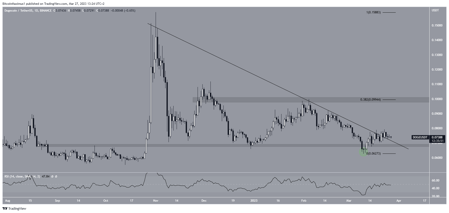 A Dogecoin subiu desde 10 de março. Pouco depois, ela recuperou a área de suporte de US$ 0,068 e rompeu uma linha de resistência que existia desde novembro de 2022. As rupturas dessas estruturas de longo prazo geralmente levam a movimentos ascendentes significativos .