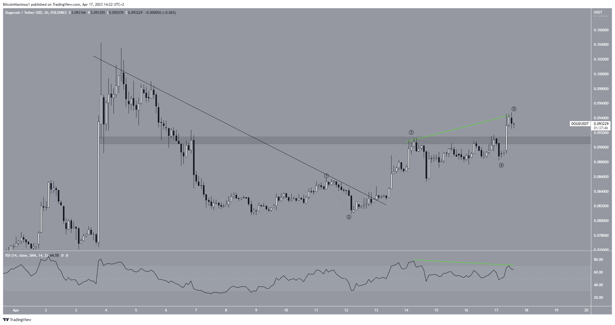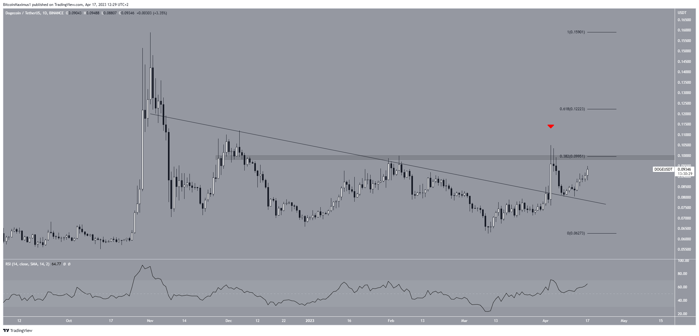 A DOGE caiu sob uma linha de resistência descendente desde novembro de 2022. A linha causou inúmeras rejeições, a mais recente em 2 de abril.