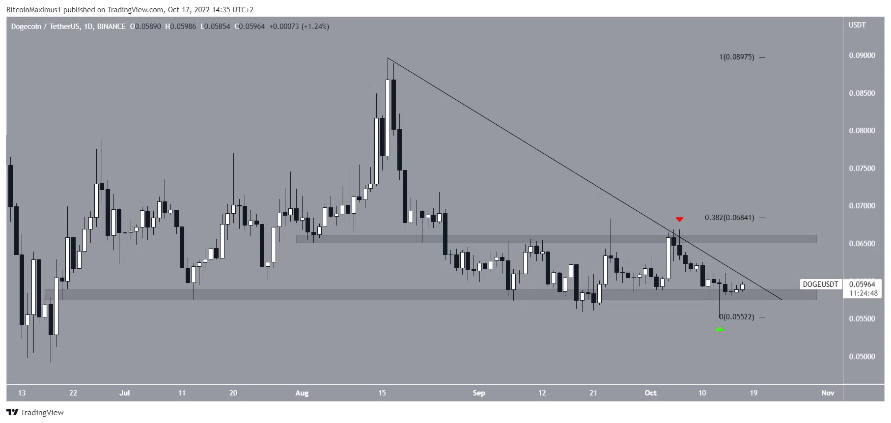 A rejeição levou a uma mínima de US$ 0,055 em 13 de outubro. Embora isso parecesse ter causado um colapso abaixo da faixa de US$ 0,058, a Dogecoin saltou e criou um longo pavio inferior.