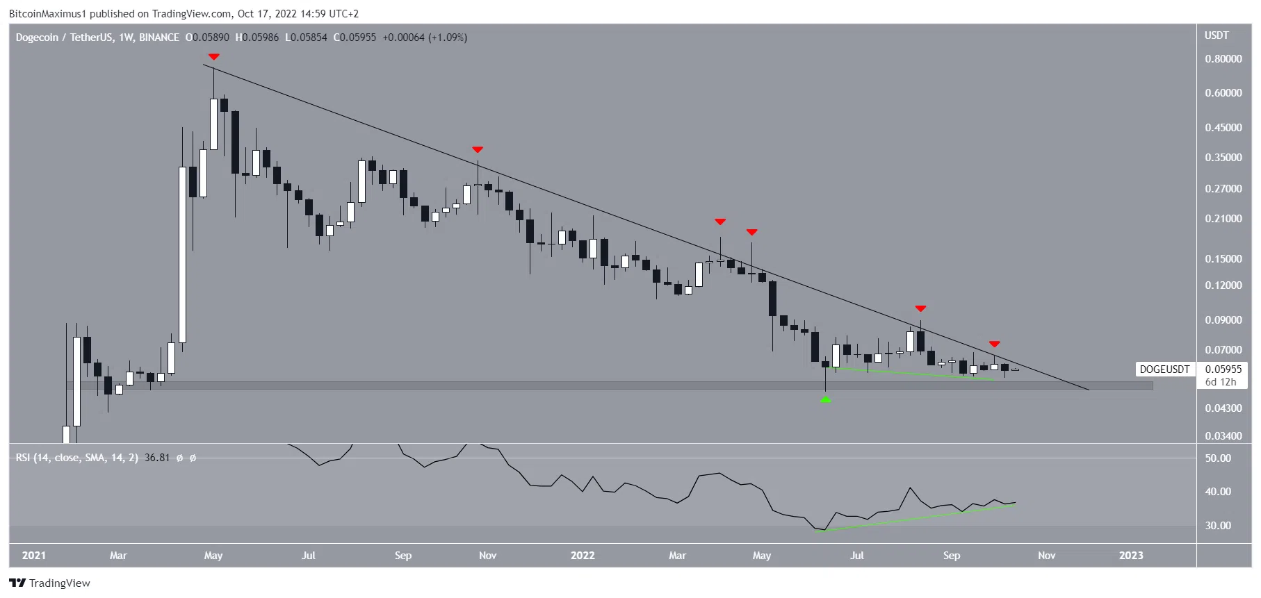 O preço do DOGE vem diminuindo desde maio de 2021, quando atingiu um preço recorde de US$ 0,073. A queda seguiu uma linha de resistência descendente.