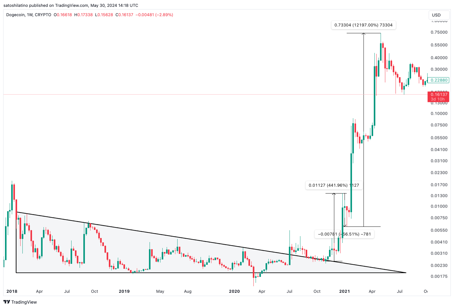Em seguida, em novembro de 2020, o Dogecoin rompeu a linha de resistência do triângulo, desencadeando uma alta de 441,96%. Isso foi seguido por uma correção de 56,31%, após a qual o preço do DOGE disparou em impressionantes 12.197%.