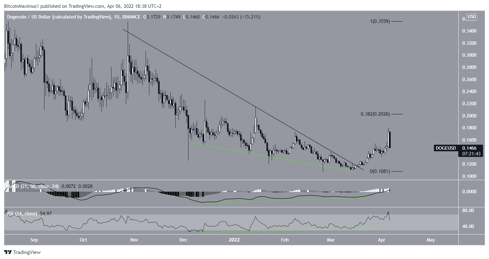 O gráfico diário mostra que o token rompeu uma linha de tendência de baixa que estava em vigor desde 28 de outubro. O preço estourou em 18 de março e atingiu uma alta de US$ 0,179 na terça-feira (5).