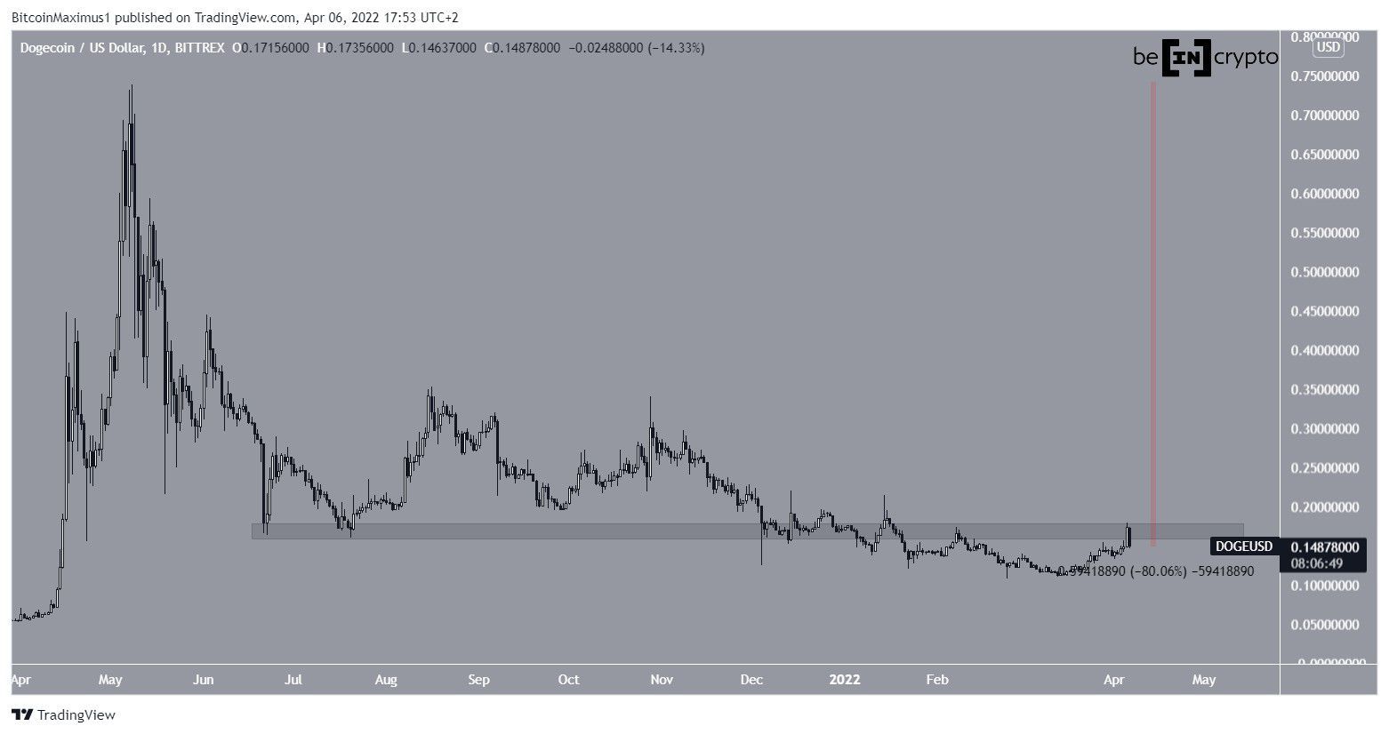A DOGE está em tendência de baixa desde que atingiu o preço recorde de US$ 0,73 em 8 de maio do ano passado. Em junho, o preço saltou na área de suporte horizontal de US$ 0,165. No entanto, o salto foi fraco e o preço caiu no início deste ano.