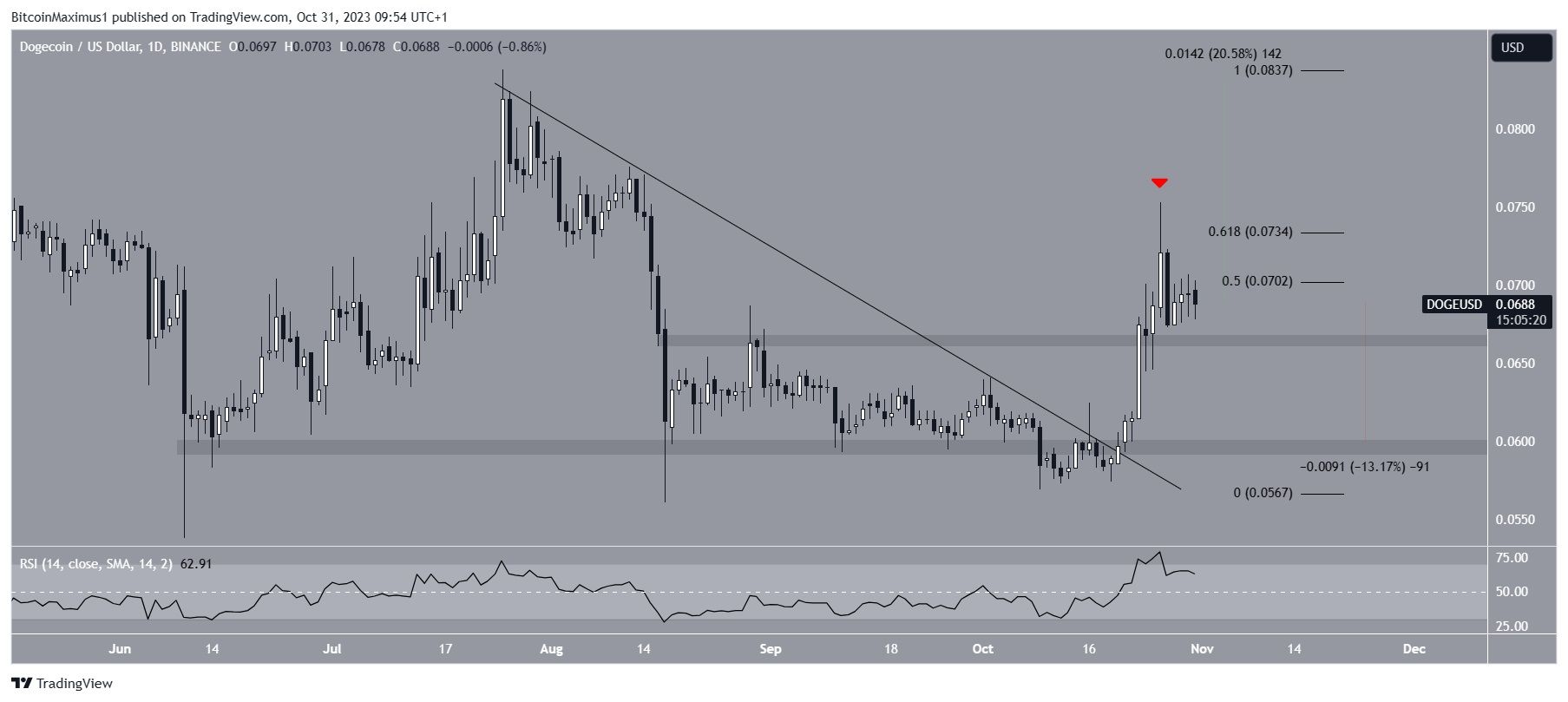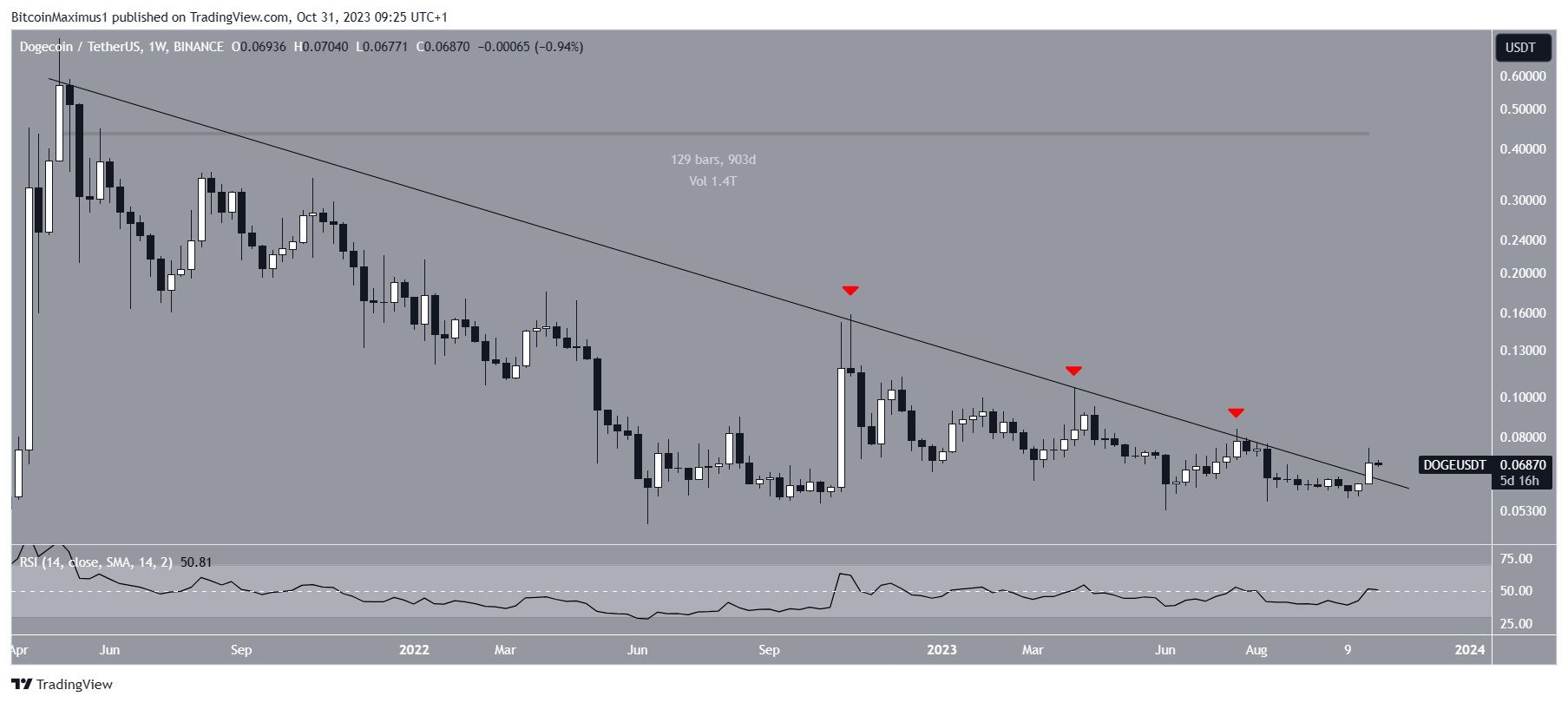 A análise do gráfico diário fornece uma perspectiva de alta, alinhando-se com o rompimento da linha de tendência de baixa de 900 dias. Em 20 de outubro, a memecoin rompeu uma linha de tendência de baixa de curto prazo.
