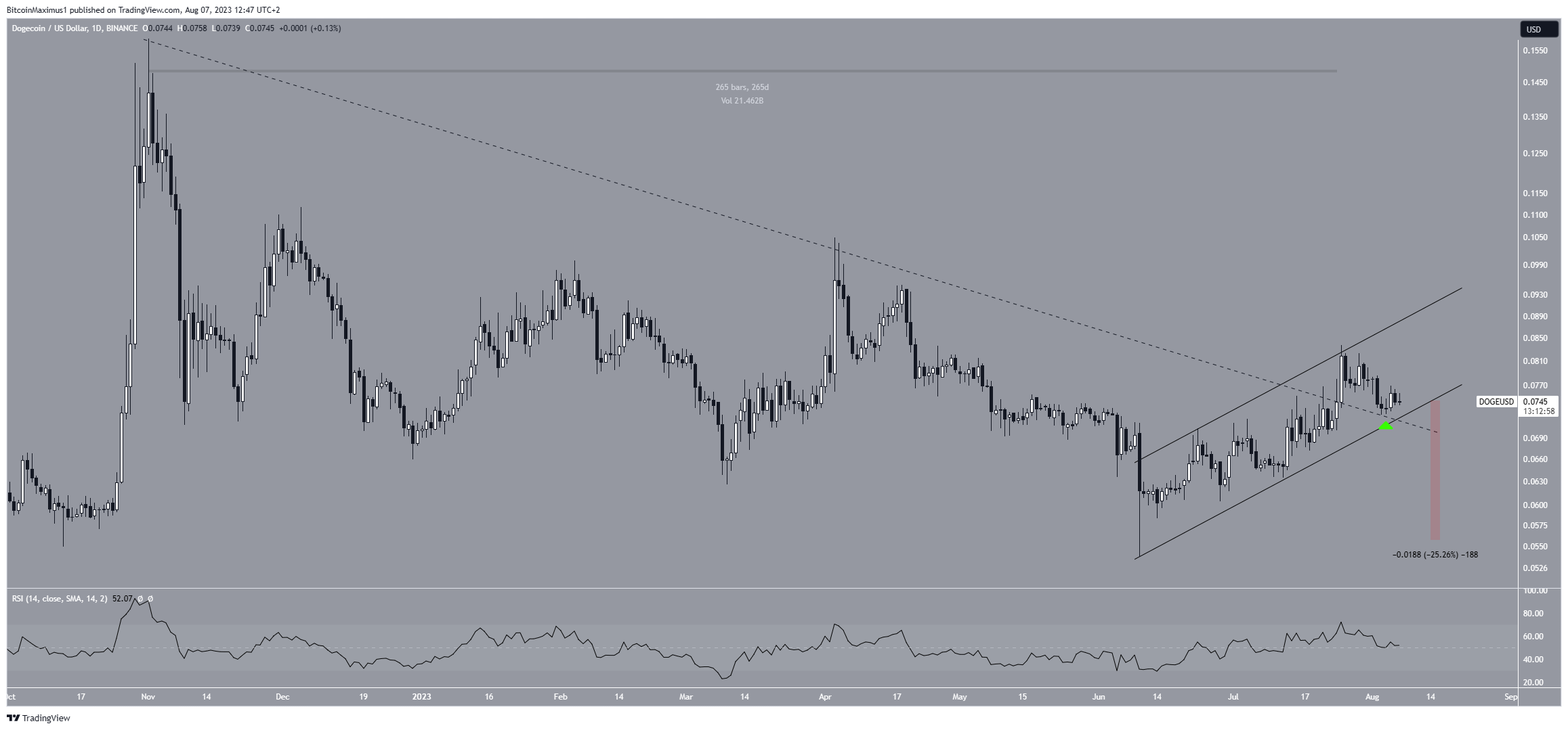 A análise técnica para o gráfico semanal mostra que a DOGE caiu abaixo de uma linha de resistência descendente desde maio de 2021, quando atingiu a máxima histórica de US$ 0,739. Esse declínio levou a um ponto baixo de US$ 0,049 (ícone verde) em junho de 2022.