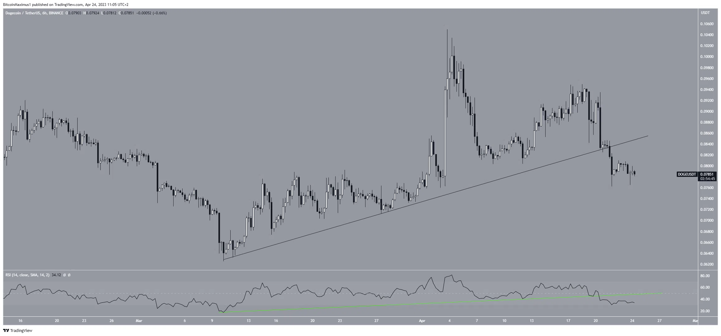 A primeira razão para isso vem da ação do preço. A DOGE perdeu uma linha de suporte ascendente em 21 de abril. Quando uma linha mede a inclinação de um movimento ascendente, sua quebra geralmente indica que o movimento ascendente chegou ao fim.