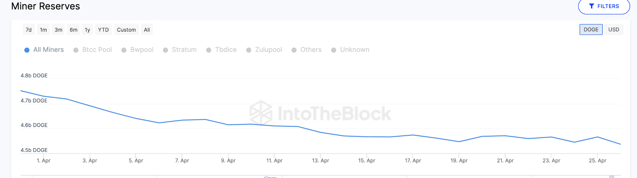 Os mineradores da rede Dogecoin parecem estar vendendo suas recompensas, o que indica que o sentimento é de pessimismo. Os dados do Miner Reserves monitoram a quantidade de uma determinada criptomoeda mantida nos endereços de carteira dos principais mineradores.