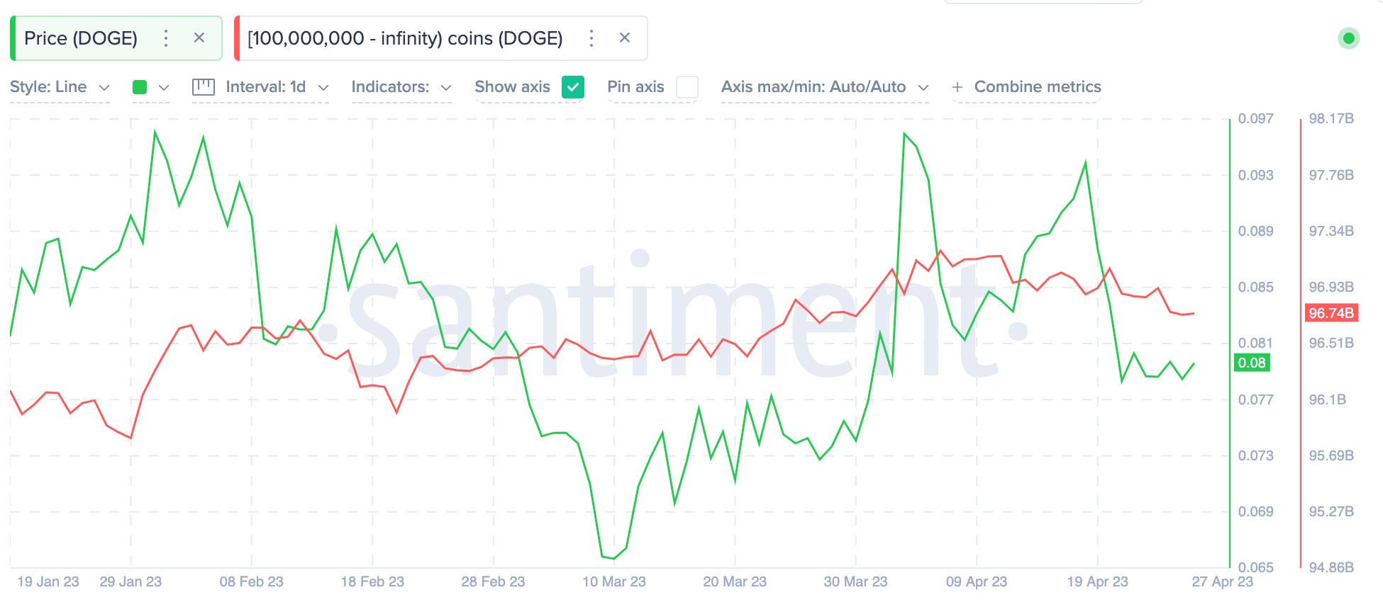 Da mesma forma, os dados on-chain revelam que as baleias no ecossistema Dogecoin começaram recentemente a esgotar seus saldos. O Gráfico de Santiment abaixo mostra que um grupo de baleias com 100 milhões de DOGE ou mais descarregaram estrategicamente 440 milhões de moedas no valor de aproximadamente US$ 35,2 milhões nos últimos vinte dias.