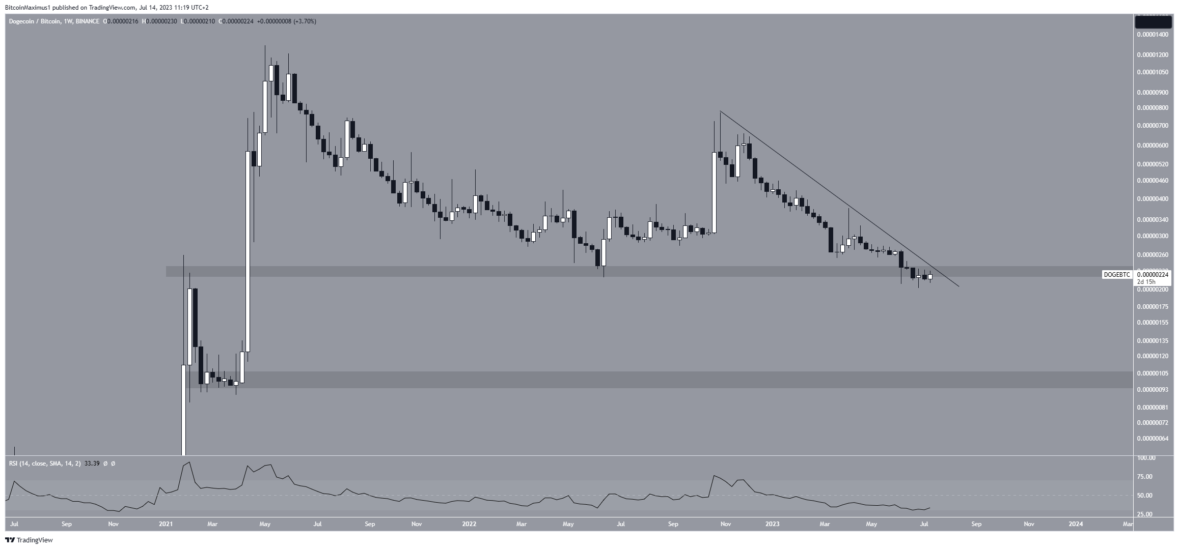 Por mais que o gráfico DOGE/USDT permaneça indeterminado, o preço da Dogecoin perde terreno contra o Bitcoin. O gráfico semanal mostra que o par DOGE/BTC fechou abaixo da área de suporte de 0,0000023 satoshis.