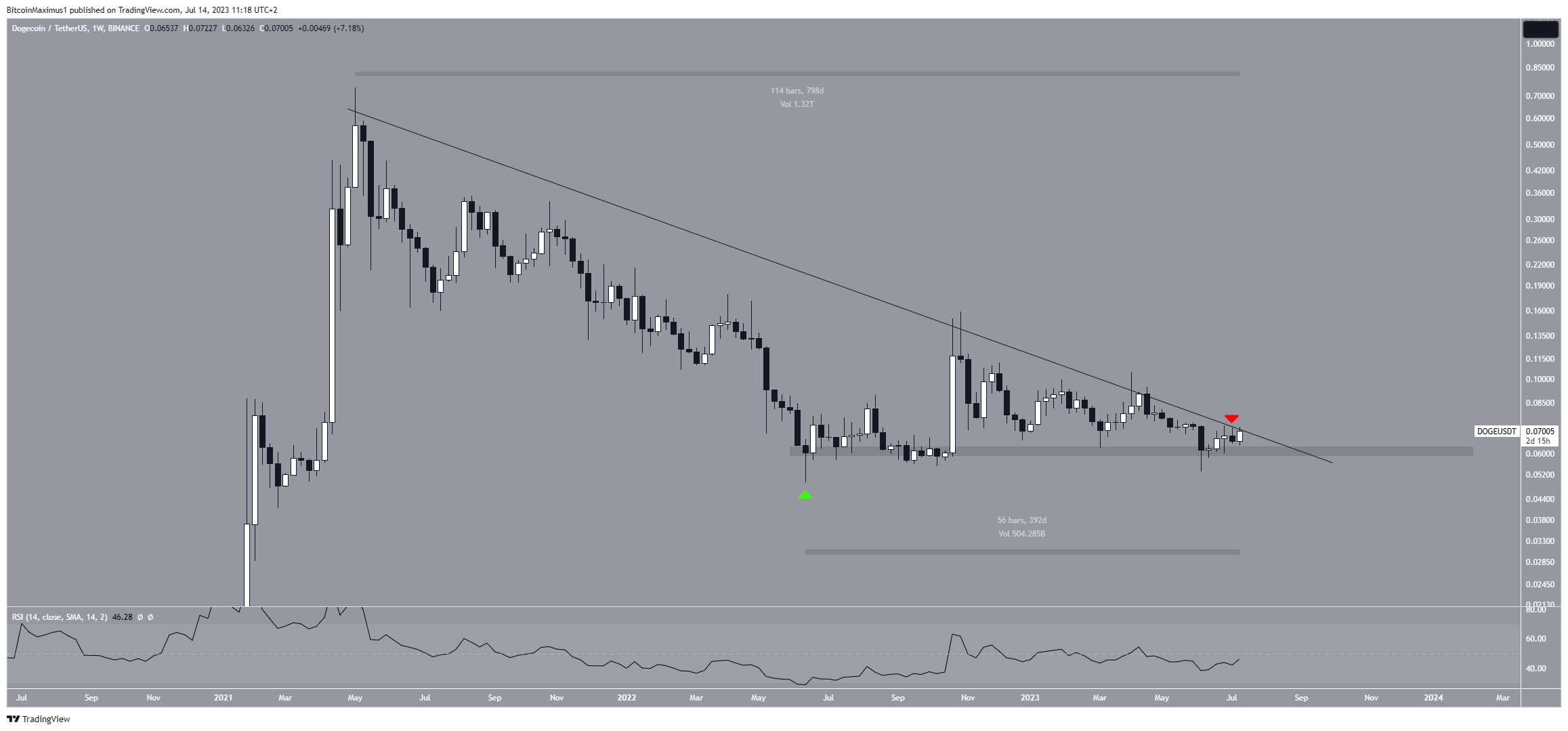 Com base na análise técnica do gráfico semanal, observa-se que a DOGE caiu abaixo de uma linha de tendência de baixa após atingir sua máxima histórica de US$ 0,739 em maio de 2021. Essa queda levou a uma mínima de US$ 0,049 em junho de 2022.