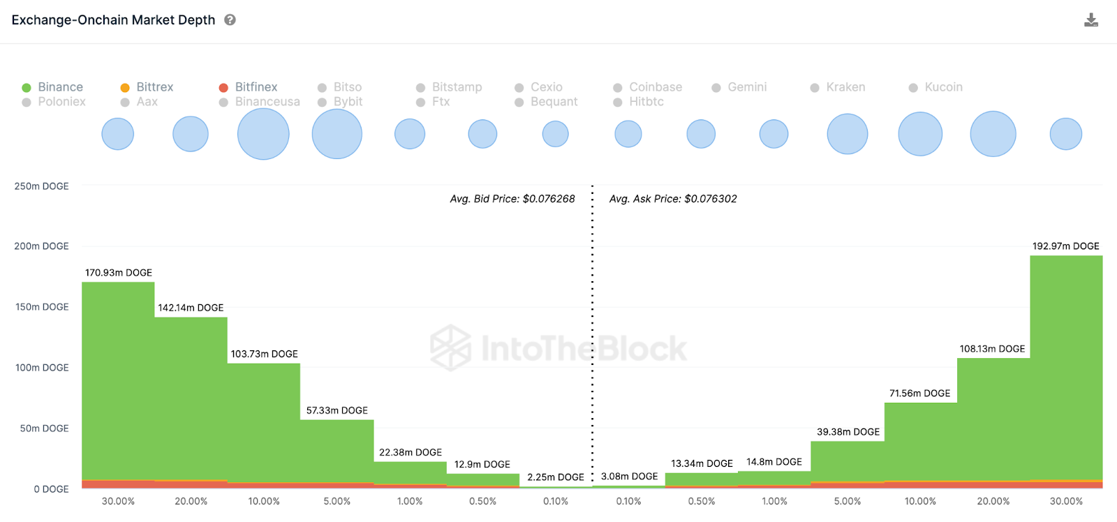 Conforme ilustrado abaixo, os ursos colocaram pedidos ativos para vender 193 milhões de DOGE, 30% acima dos preços atuais. Esse montante é significativamente maior do que os 170,93 milhões DOGE feitos pelos compradores. Isso significa que os vendedores podem ter que competir baixando os preços para atender seus pedidos.