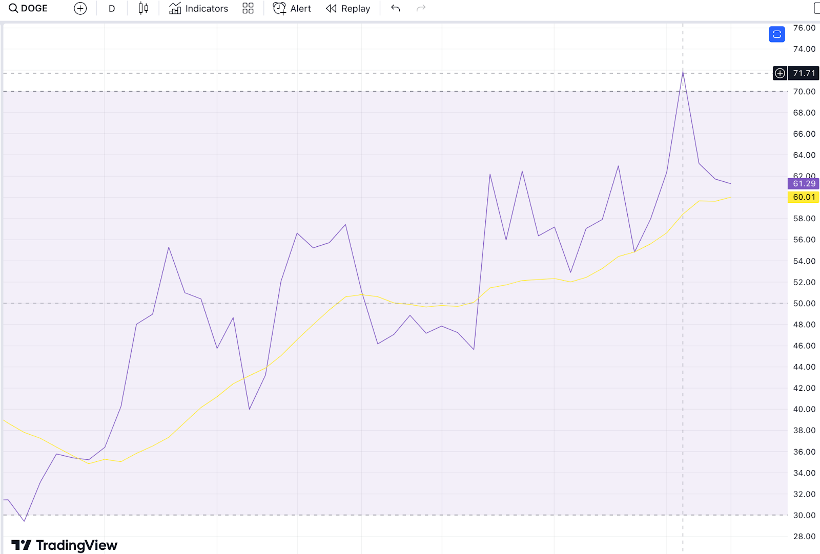 De acordo com o Índice de Força Relativa, os ursos (vendedores) da Dogecoin parecem ter recuperado o controle da tendência. Depois de atingir picos de euforia após a mudança de nome do Twitter, o indicador caiu abaixo da marca crítica de 70, atingindo 61,29 nesta sexta-feira (28).